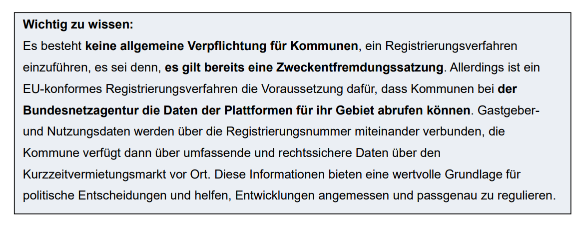 Ein Registrierungsverfahren ist nur in Kommunen mit Zweckentfremdungssatzung zwingend erforderlich. Alle anderen Kommunen können frei darüber entscheiden, ob sie ein EU-konformes Verfahren einrichten.